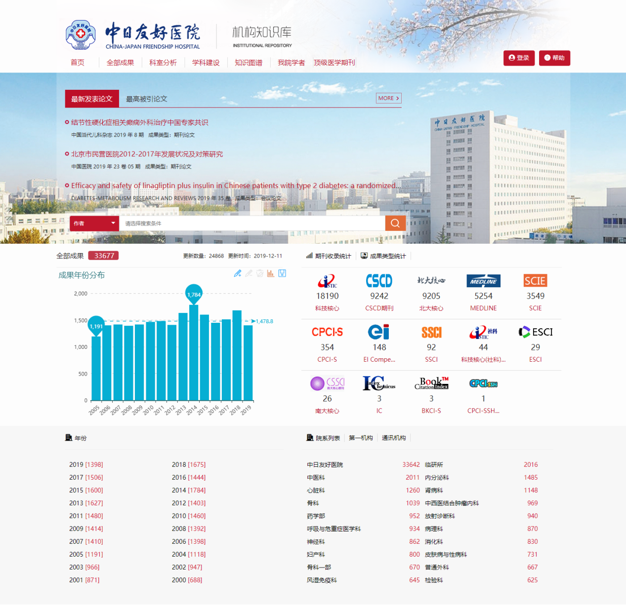 “首页”提供了多种成果的组织和浏览方式,包括系统更新时间和成果数量、最新发表论文、最高被引论文、成果年份分布、成果收录及类型、院系列表、第一机构、通迅机构成果。如图1-1。