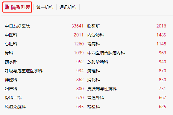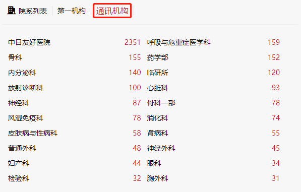 院系列表:根据机构下学者成果归属院系的属性,对成果按照机构的院系(科室)进行归类,并显示每一院系(科室)的成果数量。如图1-8。点击机构或某一院系(科室),可以浏览和获取这一院系(科室)下的所有成果。