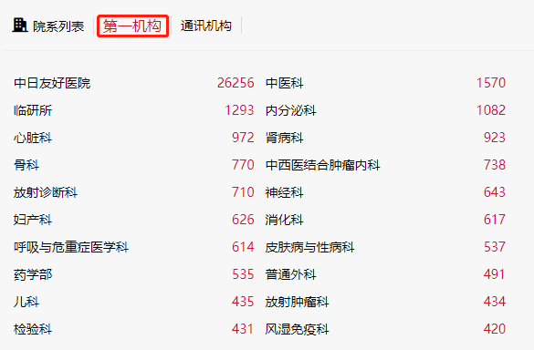 第一机构:显示本机构及本机构院系(科室)下第一机构的数量。如图1-9。点击机构或某一院系(科室),可以浏览和获取这一机构和院系(科室)下的所有成果。
