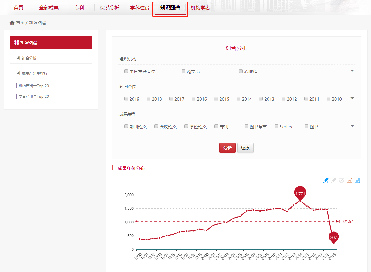 “知识图谱”页面通过多种条件组合以图谱的形式进行分析统计成果数量。如图3-13。