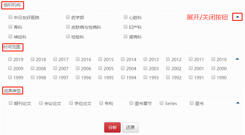 通过选择“组织机构”、“时间范围”、“成果类型”自由的搭配过滤条件,生成各种多维度的图谱。如图3-14。