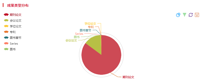 成果类型分布图谱:默认以饼图的形式显示本机构下成果类型的数量。如图3-16。可通过选择过滤条件(如图3-14)重新生成图谱。