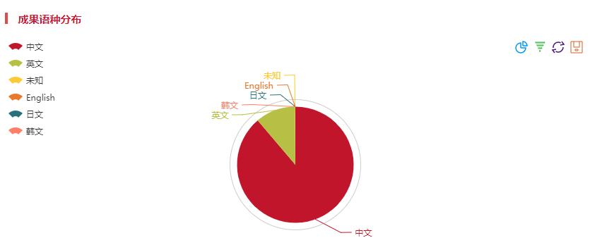 成果语种分布图谱:默认以饼图的形式显示本机构下所有语种成果数量的图谱。如图3-17。可通过选择过滤条件(如图3-14)重新生成图谱。