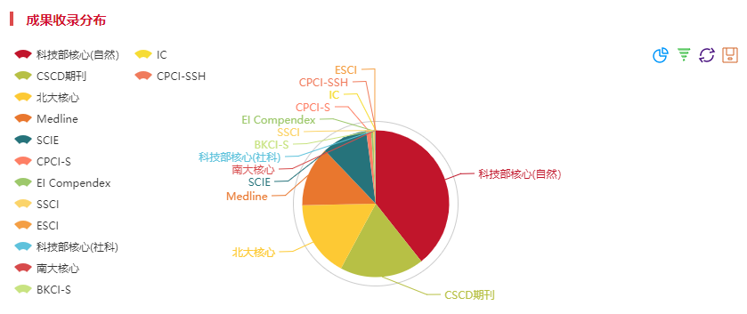 成果收录分布:默认以饼图的形式显示本机构下所有成果收录的情况和数量。如图3-18。可通过选择过滤条件(如图3-14)重新生成图谱。