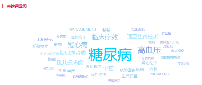 关键词云:展示了本机构下学者研究主题,通过颜色的深浅,字的大小得知学者研究领域,指导学者往哪个方向做深入研究。如图3-19。可通过选择过滤条件(如图3-14)重新生成图谱。