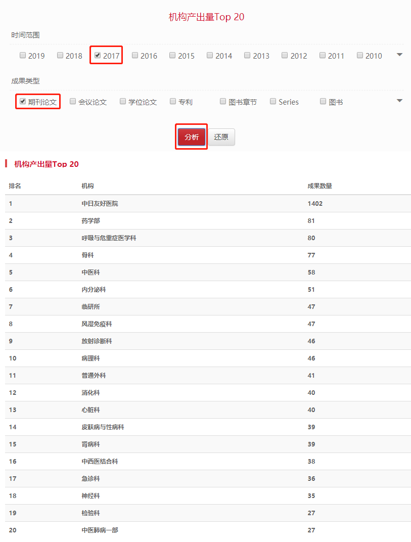 机构产出Top20:默认显示本机构及院系(科室)下前20名机构的成果数量,以降序排列。用户可以通过选择“时间范围”、“成果类型”自由的搭配过滤条件,重新生成排序。如图3-20。
