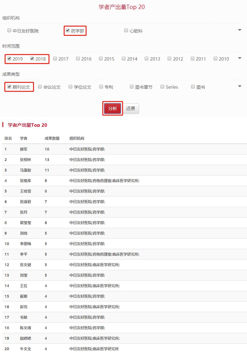 学者产出Top20:默认显示本机构及院系(科室)下前20名学者的成果数量,以降序排列。用户可以通过选择“时间范围”、“成果类型”自由的搭配过滤条件,重新生成排序。如图3-21。