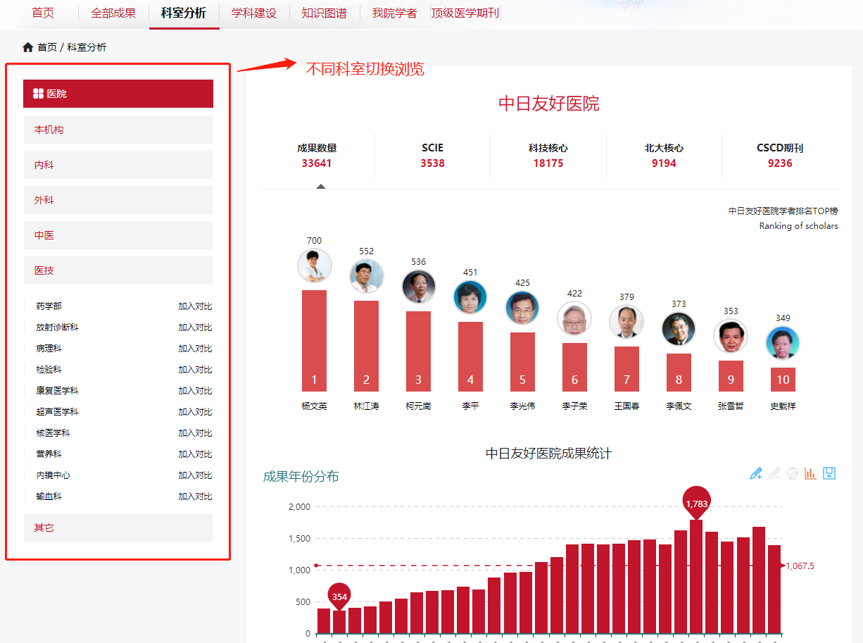 普通用户“科室分析”页默认显示本机构下全部成果、SCIE、科技部核心(自然)、北大核心、CSCD期刊的数量,对本机构及本机构科室下的前10名学者进行排名。并以图谱的形式呈现多维度的成果数量。通过左侧可以切换本机构及本机构下院系(科室),并且可以多科室进行对比。如图3-6。
